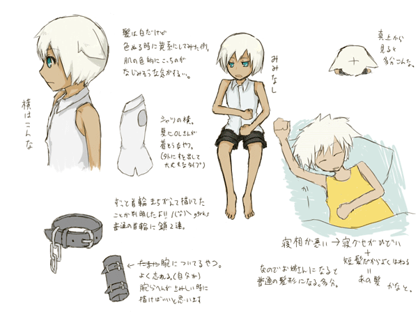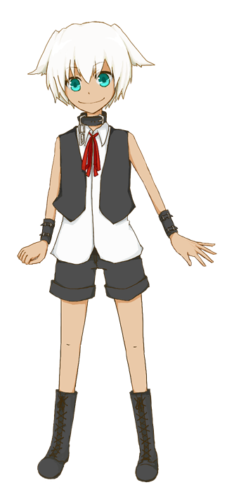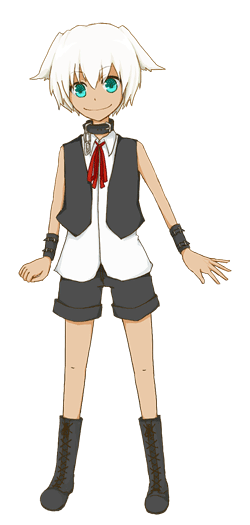 外見まとめ:褐色肌・白髪・青緑眼・リボンタイ・耳髪・首輪・ホットパンツ・黒ベスト