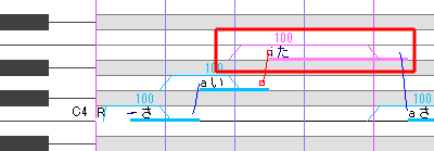 エンベロープエディタの黒の線が先行発声値で、原音設定エディタの赤の線と同期しています。
