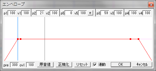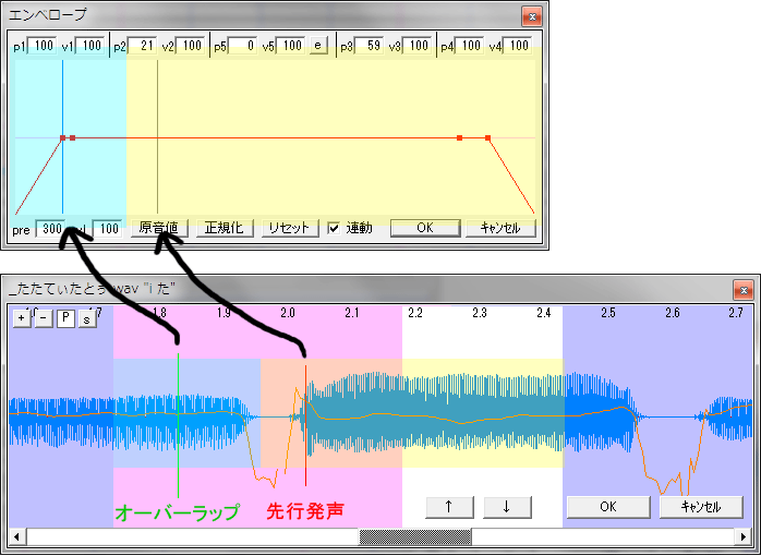 エンベロープエディタの青の線がオーバーラップ値で、原音設定エディタの緑の線と同期しています。